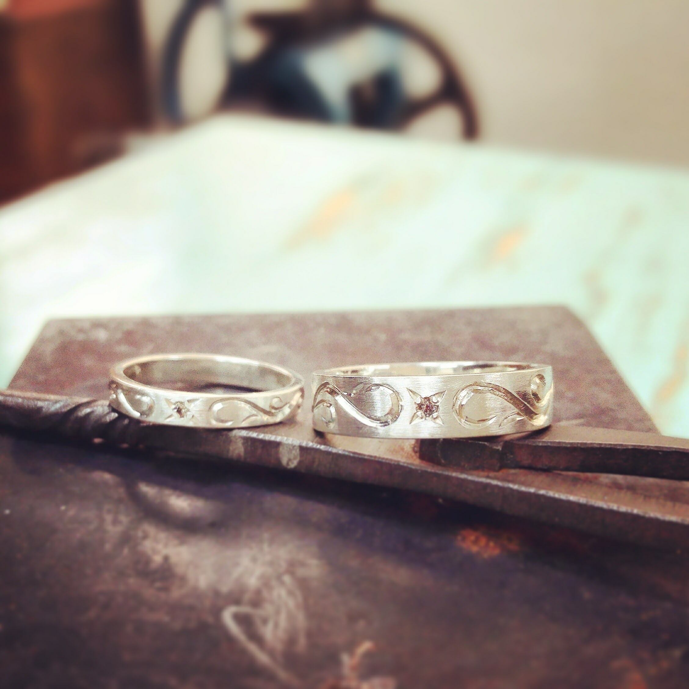 中心にはピンクダイヤを彫り留めであしらった、上品で繊細なリングです。シルバームーン彫金工房初期の作品ですが、時代に流されない超ロングセラー。
