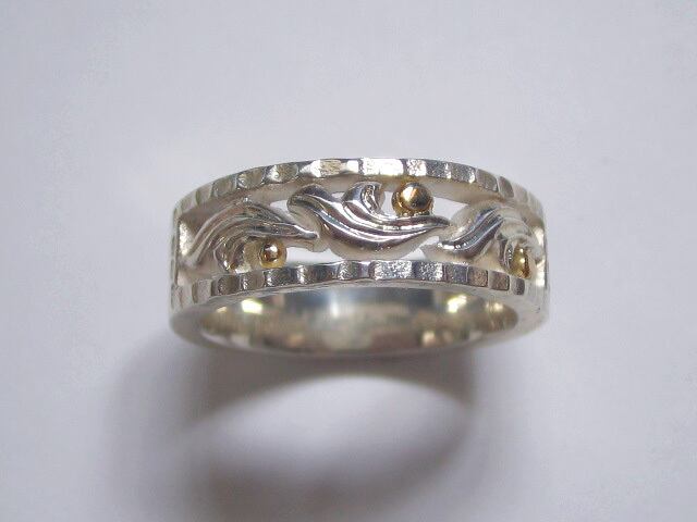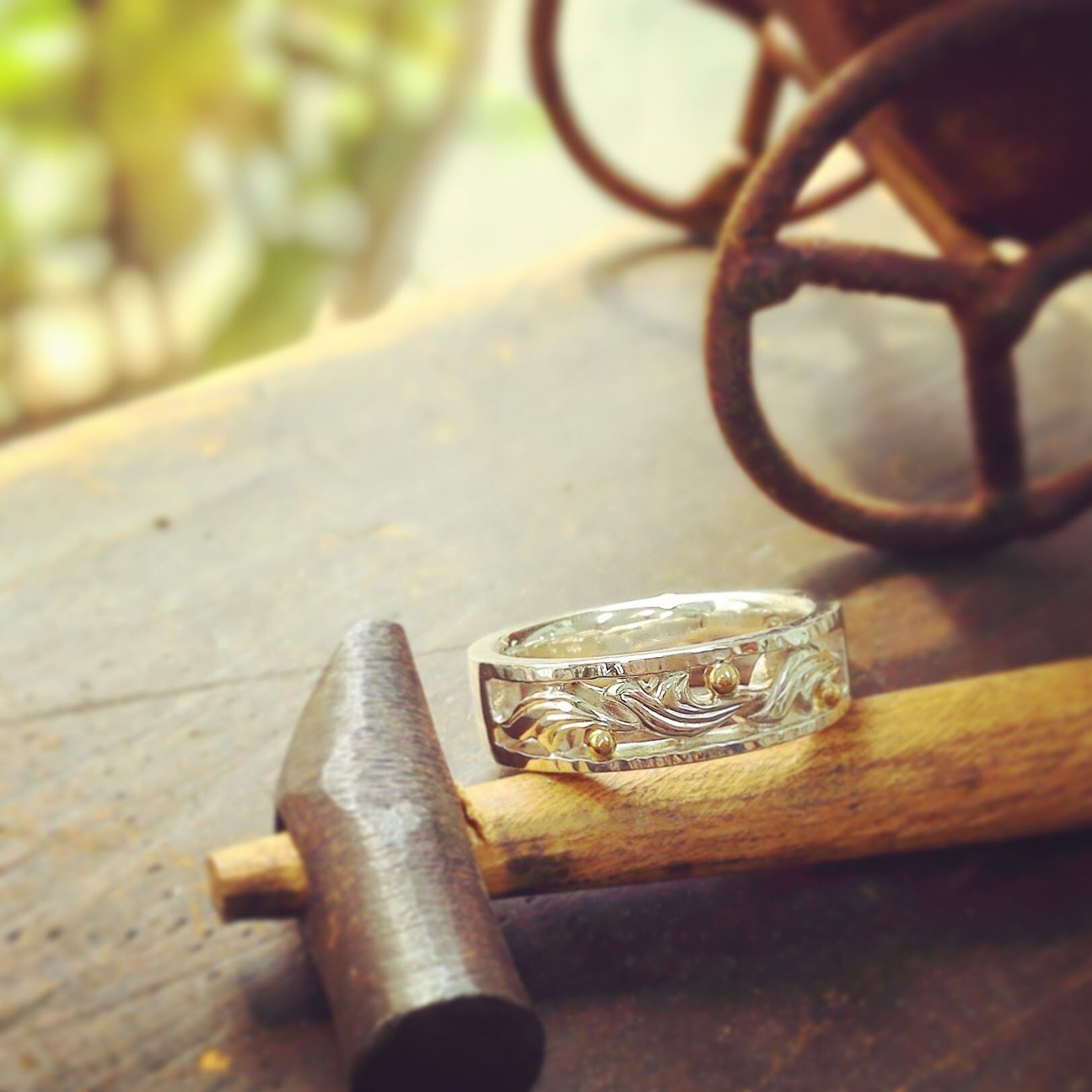 小さなリーフとK18の実を、額縁で飾ったような可愛らしいリングです。 透かしなので重たくならず、幅を感じさせない軽やかなデザイン。