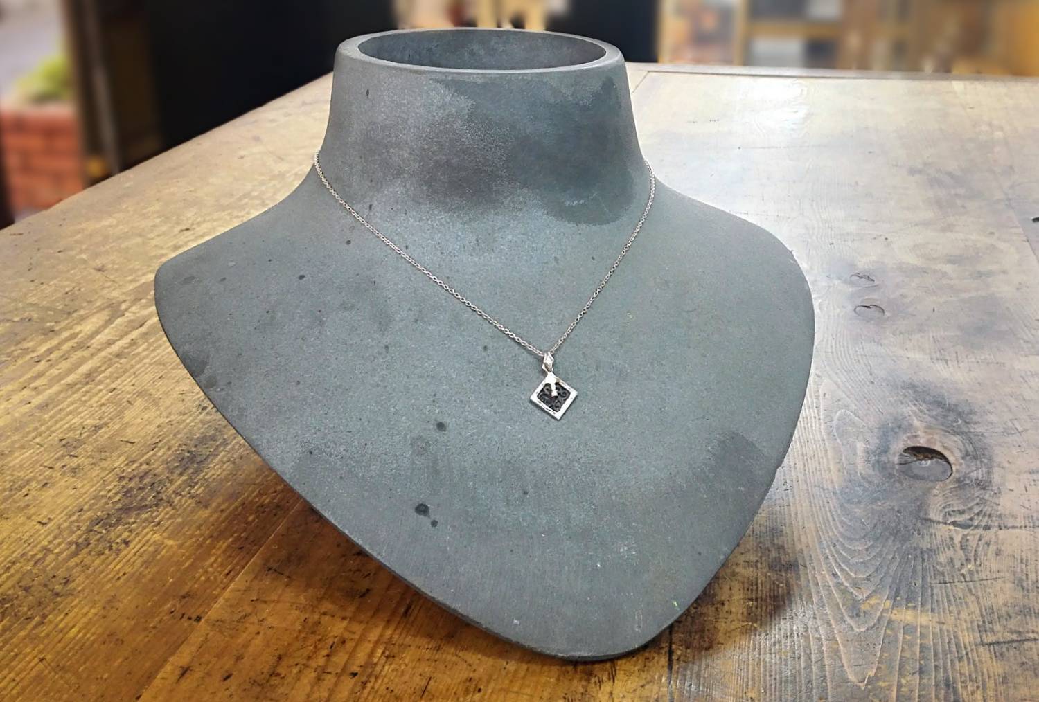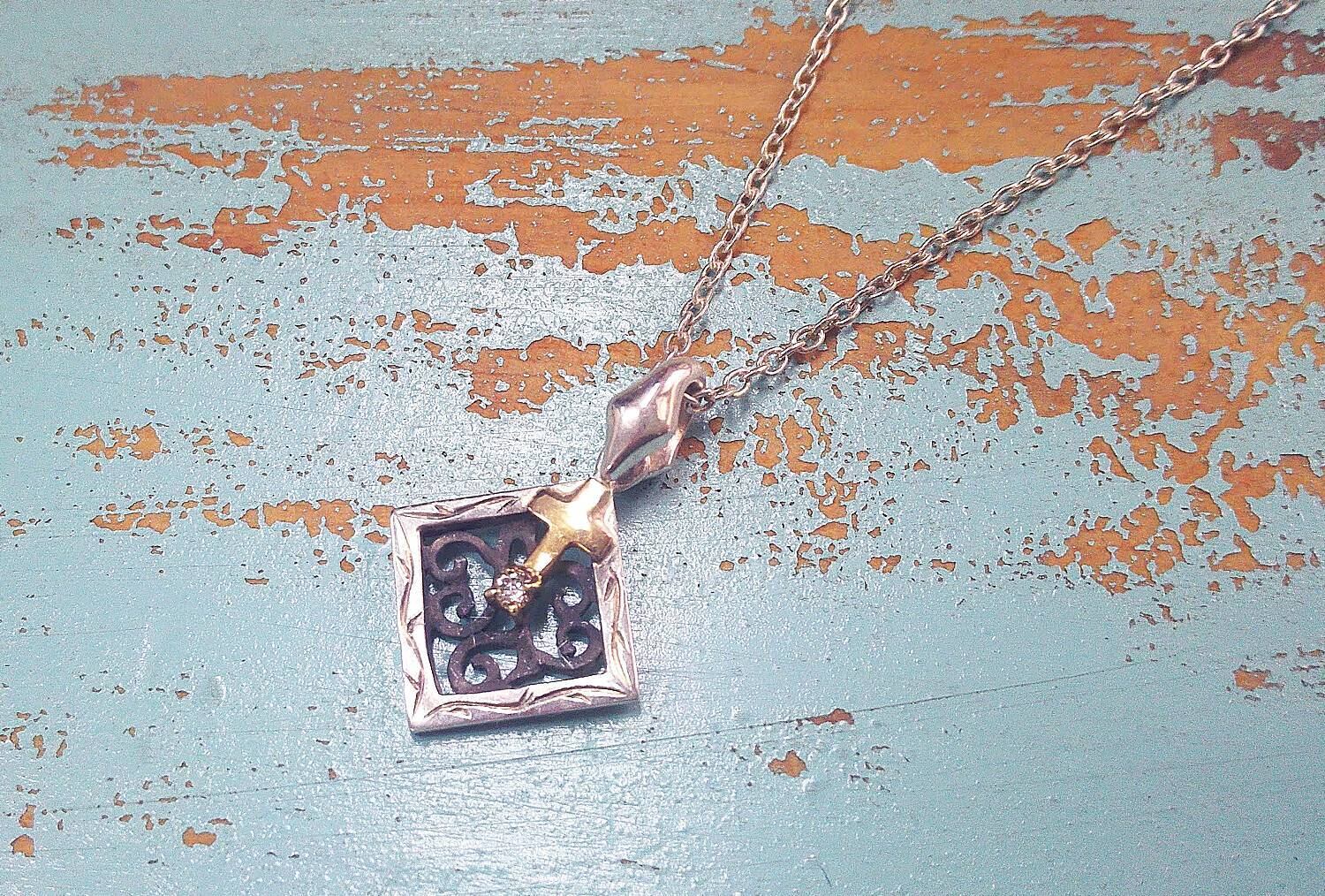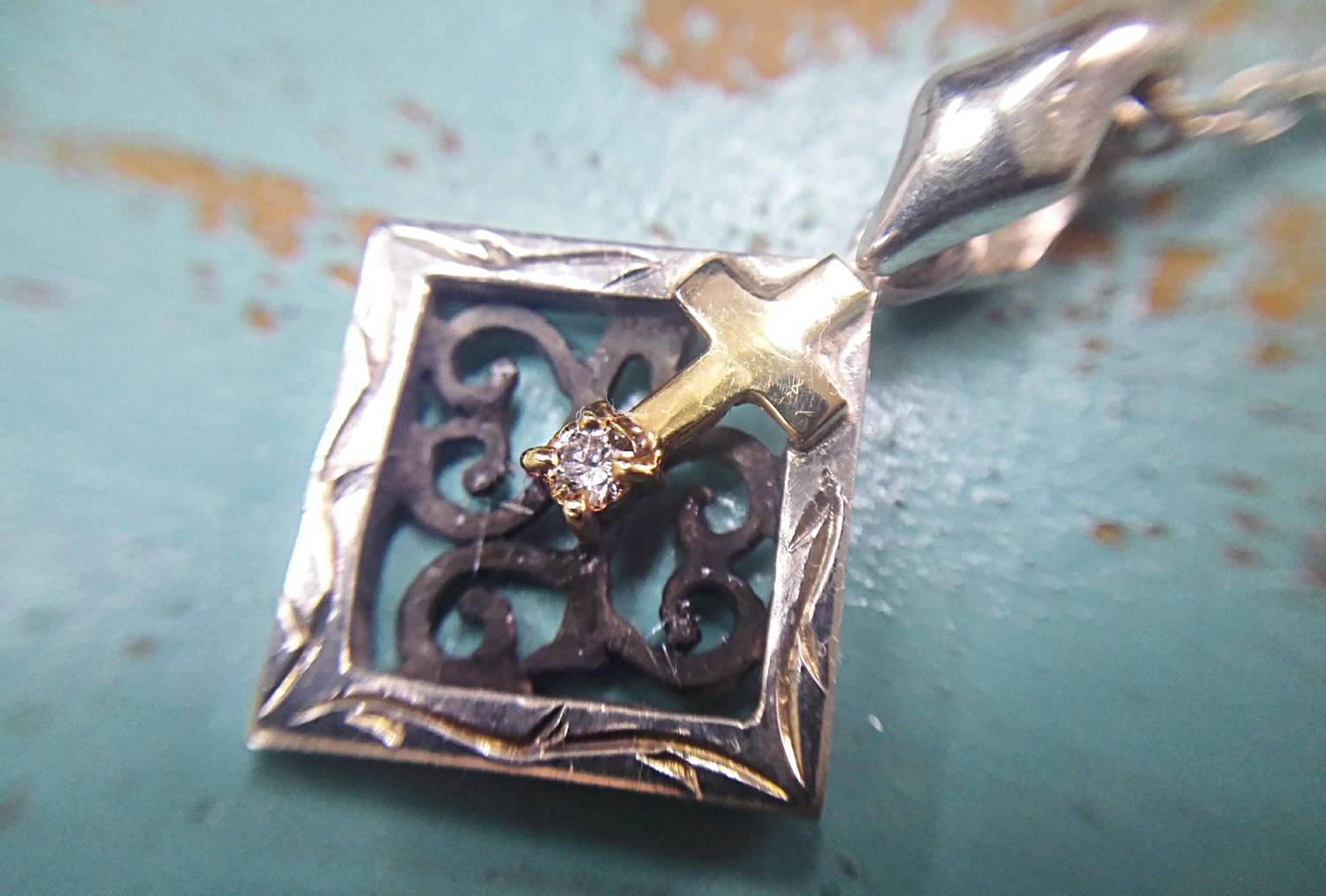 手彫りのリーフ模様の額縁に装丁された、K18のクロス。まるでそのクロスから生まれたようなダイヤが美しいペンダントトップです。