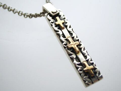 整然と並んだ3つのクロスを、ブラックはK18イエローゴールドで拵えました。イエローゴールドの明るい輝きが、いぶし銀とのコントラストでスッキリと重厚なイメージ。