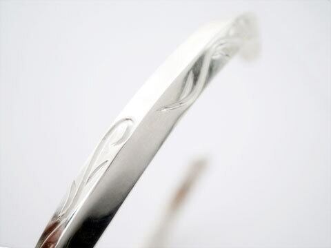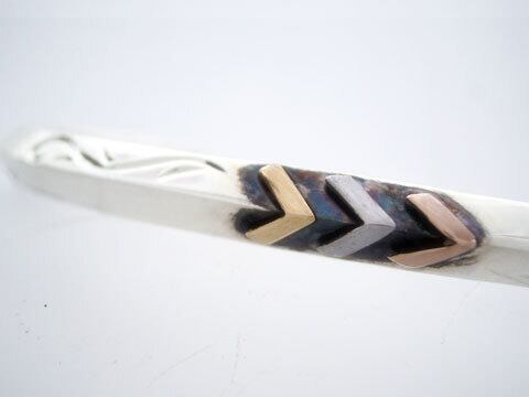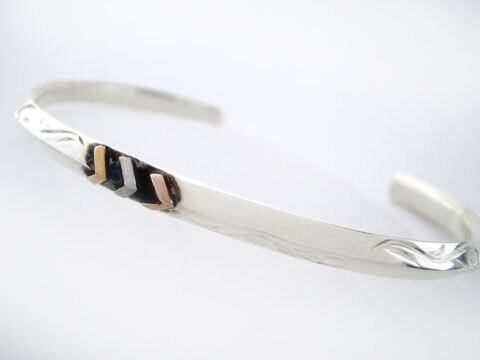 ピンク、ホワイト、イエローのK18がキチンと並んだ、上品ながらもインディアンジュエリーのようなワイルドさを持ったバングルです。左右に彫られたシルバームーンのツタ模様がK18のモチーフを引き立てて。
