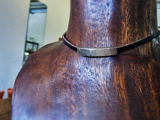 2重になっている革紐をいちどはずして1重にすればちょうどチョーカーの長さになります。プレート部分が動くからこそできるワザ。暑い夏、開襟シャツの襟からチラッとのぞかせるのもステキ。 もちろんカットソーやTシャツにも。