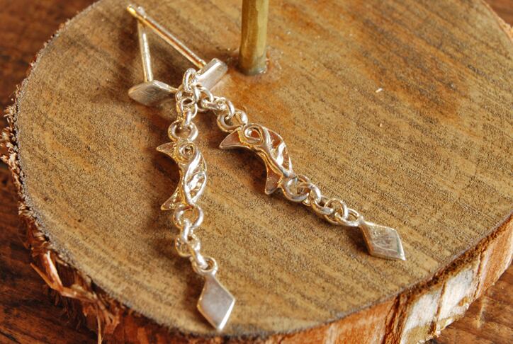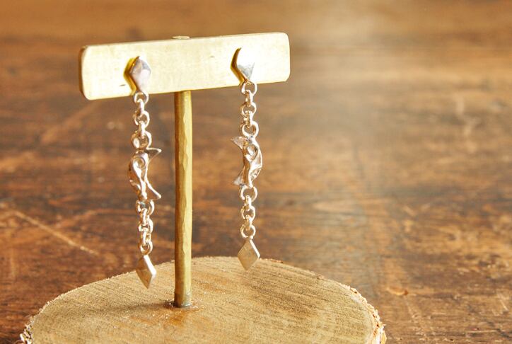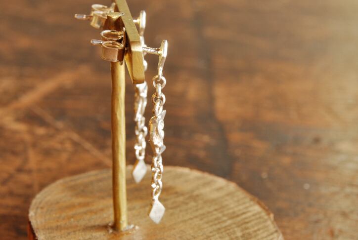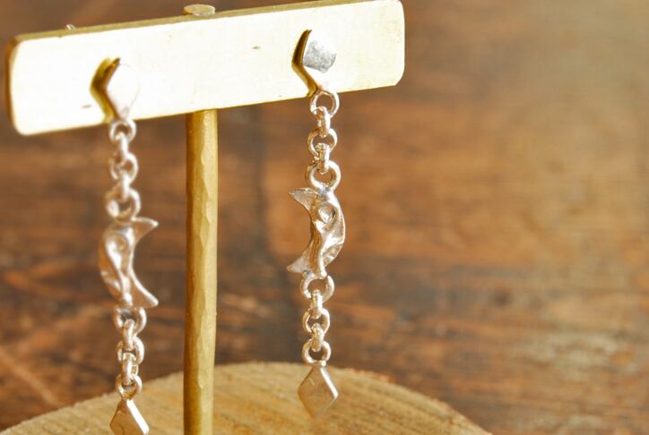 ダイヤ・月・ダイヤ。その間をロールチェーンでつなぎました。長さと重さのバランスがちょうどいいので、揺れ方もきれいです。正面だけでなく横顔も美しく彩ってくれるピアスです。